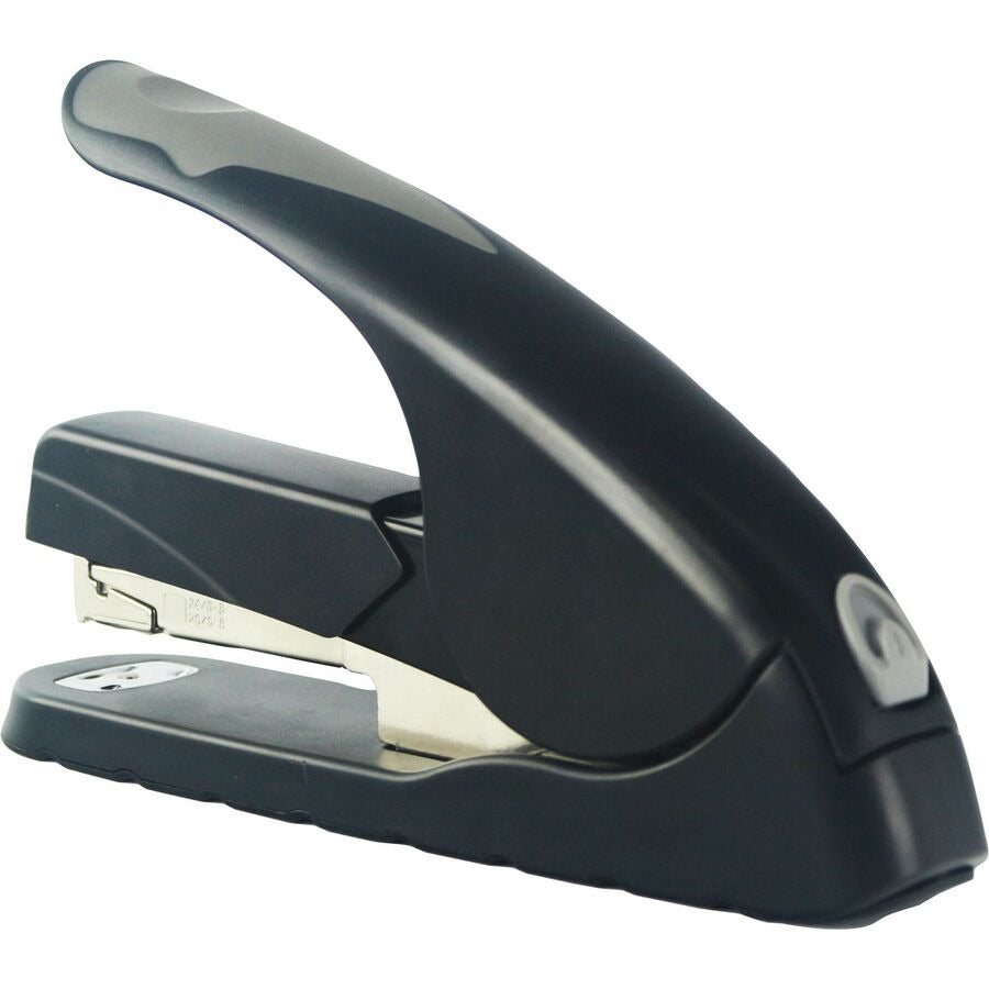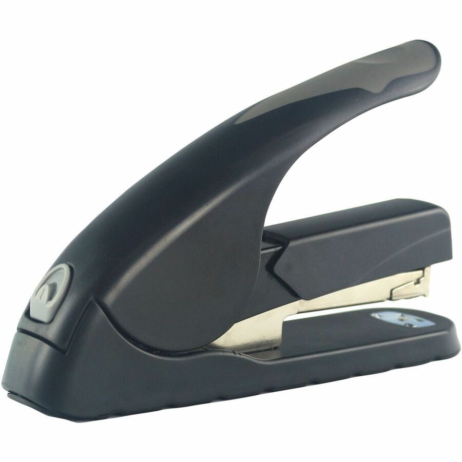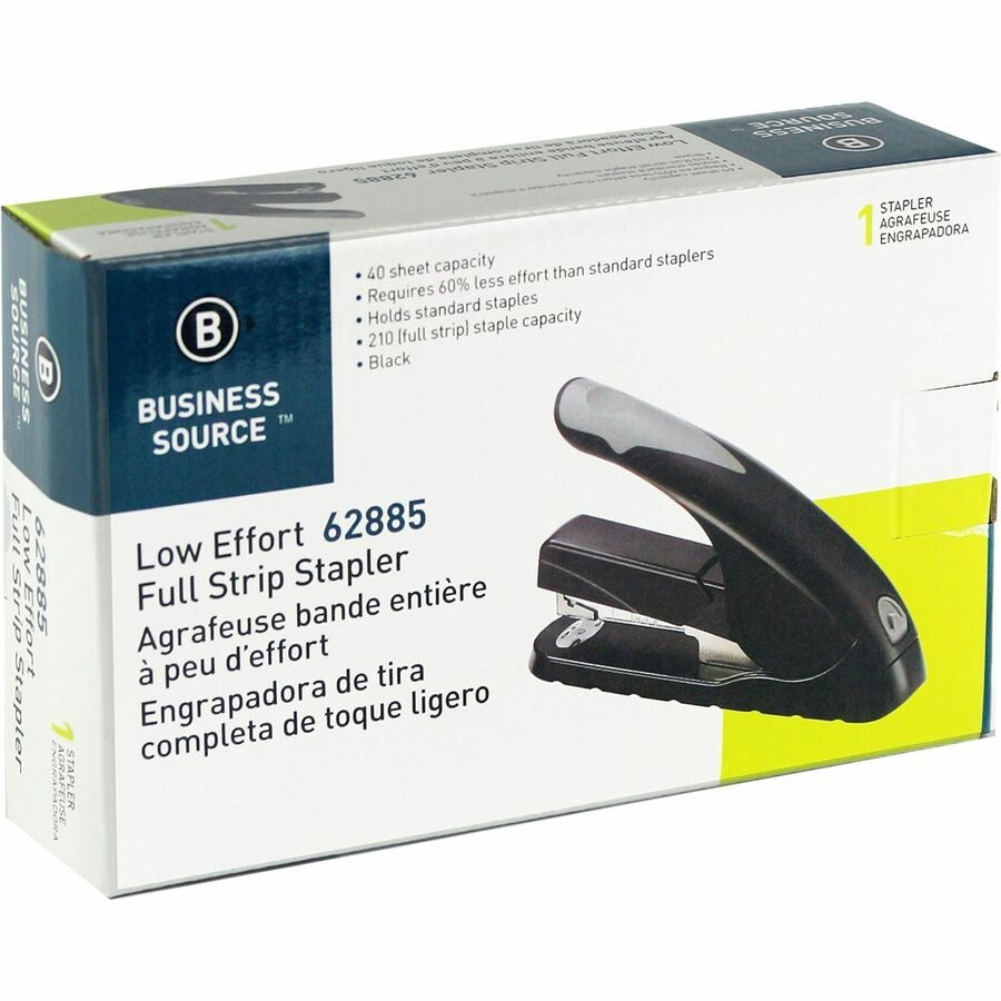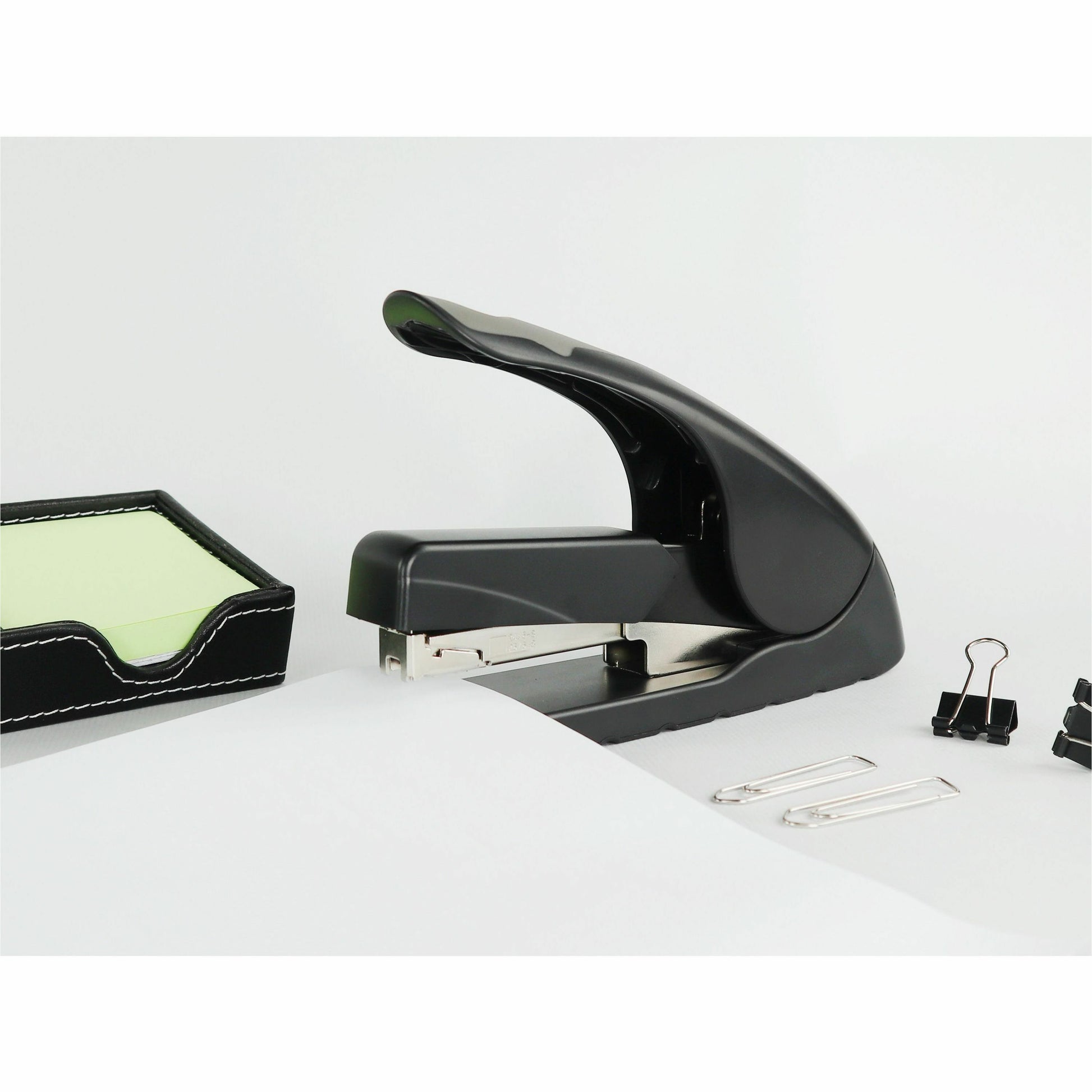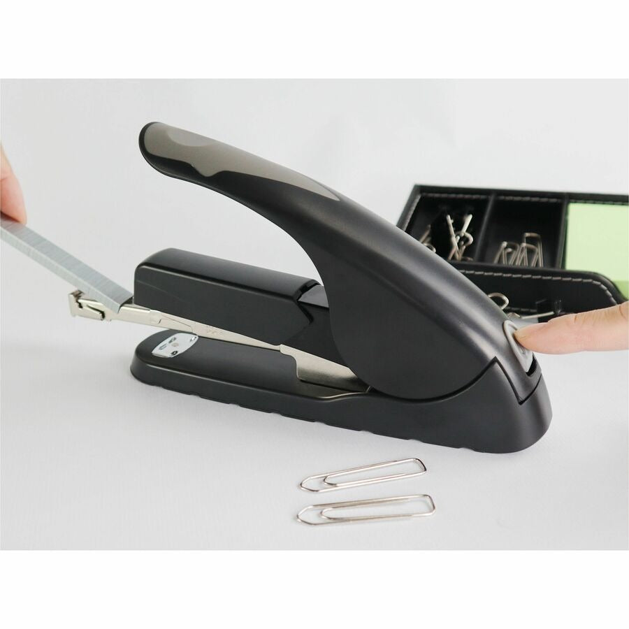 Full-strip stapler features finger-touch technology that takes 60 percent less effort. Stapler also uses both standard and high-strength staples. Standard-size staples (1/4" leg) fasten 20 sheets of 20 lb. paper. Use 5/16" staples to fasten 21 to 40 sheets. Front-loading stapler holds 210 staples. Push button releases staple magazine. Design also features an anti-slip base and rotary anvil.